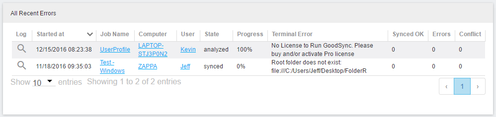 コントロールセンターレポートではすべてのランナーについてグッドシンクジョブの情報が表示されます。
